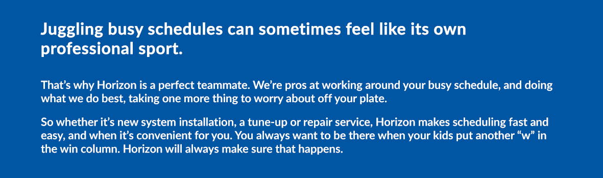 That’s why Horizon is a perfect teammate. We’re pros at working around your busy schedule, and doing what we do best, taking one more thing to worry about off your plate. So whether it’s new system installation, a tune-up or repair service, Horizon makes scheduling fast and easy, and when it’s convenient for you. You always want to be there when your kids put another “w” in the win column. Horizon will always make sure that happens.